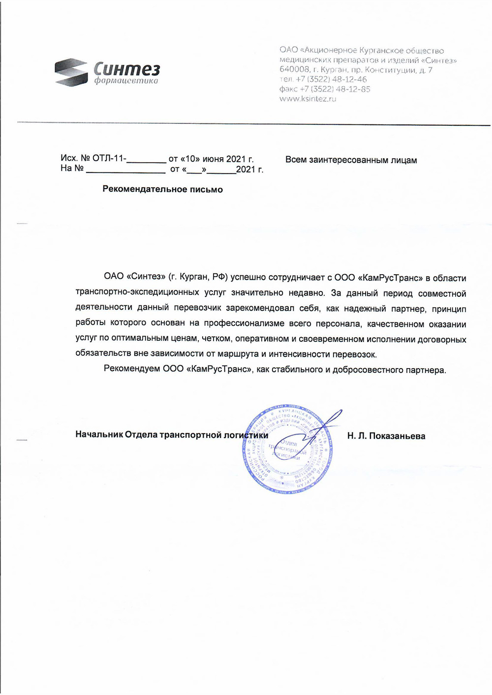 За время нашего сотрудничества ООО "КамРусТранс" показали себя как надежный и ответственный партнер, способный качественно выполнять поставленные задачи и оперативно реагировать на меняющиеся условия рынка, гибко подстраиваться под нужды партнера и ориентироваться на интересы клиента. Рекомендуем компанию ООО «КамРусТранс» как надежного и ответственного партнера для бизнеса.